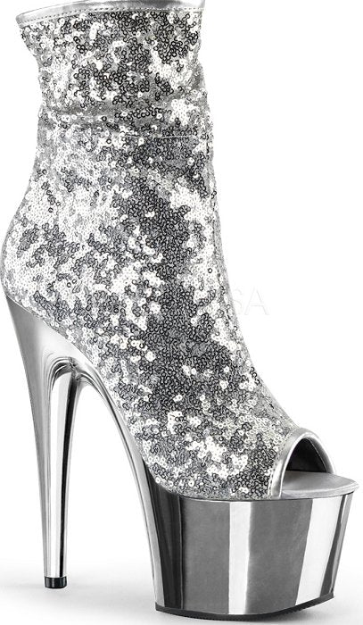7" (17.8cm) Stiletto Heel, 2 3/4" (7cm) Chrome Plated Platform Peep Toe Runched Shaft Ankle Boot, Inside Zip Closure (ADORE-1008SQ)