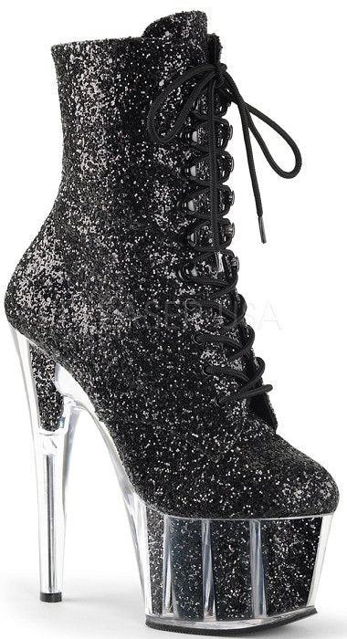 7" (178mm) Heel, 2 3/4" (70mm) Glitter Inserted Platform Open Toe/Heel Lace-Up Back Ankle Boot w/ Hidden Zip Pocket, Inside Zip Closure (ADORE-1018G)